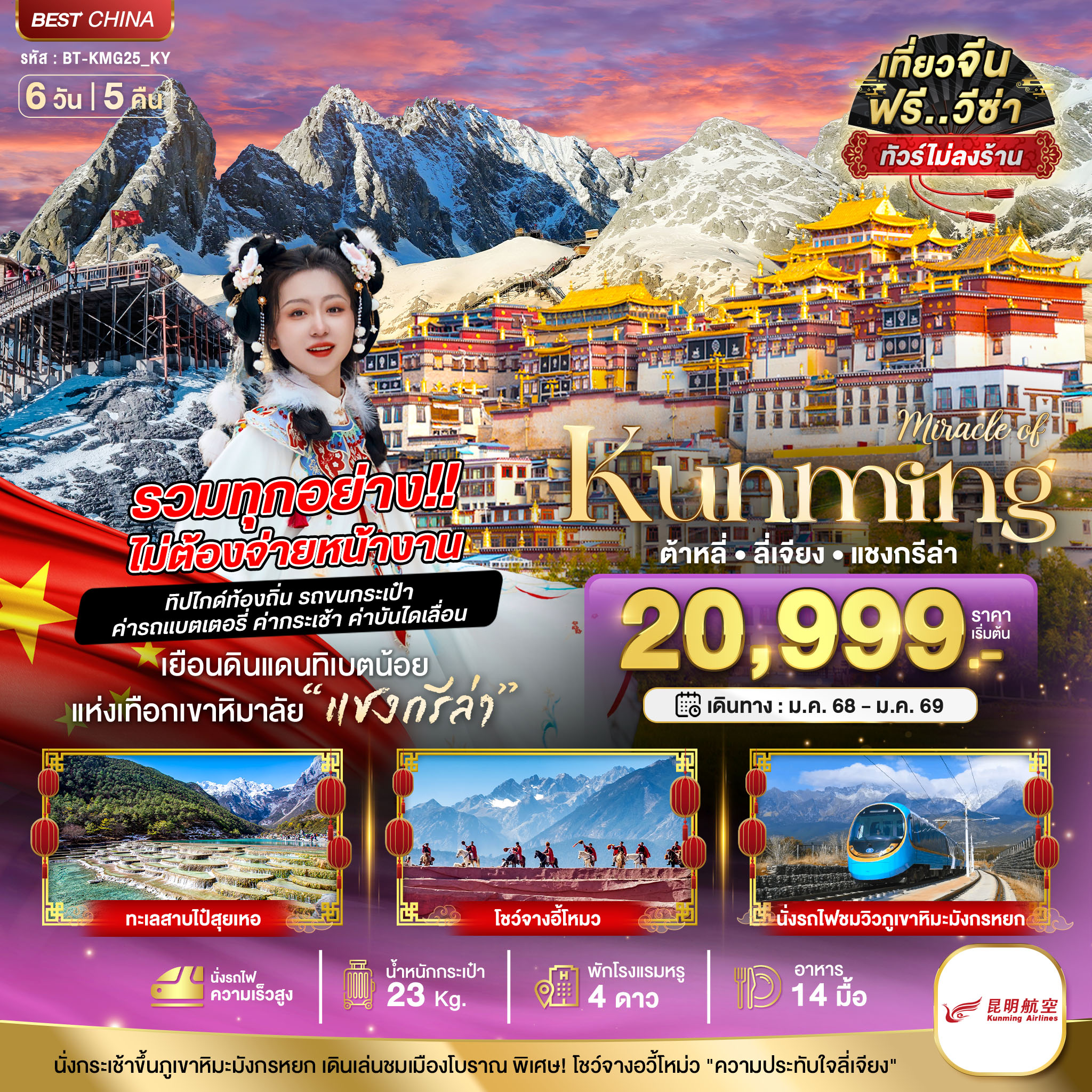 Kunming ต้าหลี่ ลี่เจียง แซงกรีล่า รวมทุกอย่าง!! ไม่ต้องจ่ายหน้างาน ทิปไกด์ท้องถิ่น รถขนกระเป๋า ค่ารถแบตเตอรี่ ค่ากระเช้า