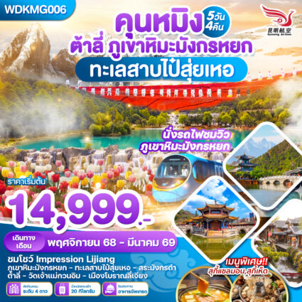คุนหมิง ต้าลี่ ภูเขาหิมะมังกรหยก ทะเลสาบไป๋สุ่ยเหอ 5วัน 4คืน ชมโชว์ Impression Lijiang ภูเขาหิมะมังกรหยก – ทะเลสาบไปสุ่ยเหอ – สระมังกรดำ ตRead more!