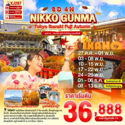 NIKKO GUNMA Tokyo Ibarakl Fuji Autumn ชมใบไม้แดง เมืองแห่งสายน้ำ ที่ ชิมะออนเซ็น อิคาโฮะ เมืองออนเซ็นเก่าแก่บนไหล่เขา สะดุดตาใบไม้เปลี่ยนสี ณ อุโมงค์เRead more!