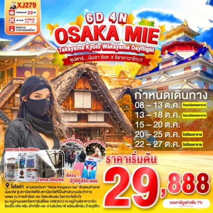 OSAKA MIE Takayama Kyoto Wakayama Dayflight ตามรอยนินจา Ninja Kingdom Ise ดินแดนค่ายกล ขอพร ณ ศาลเจ้าอิเสะ และอิสระเดินเล่นโอคาเกะโยโคะโจ พร้อมเช็คอินRead more!