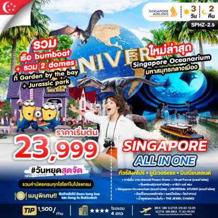 SINGAPORE ALL IN ONE ทัวร์สิงคโปร ยูนิเวอร์แซล มินเนี่ยนแลนด์ รวมเรือ bumboat + รวม 2 domes ที่ Garden by the bay + Jurassic park ช้อปปิ้งถนนออร์ชาร์ดRead more!